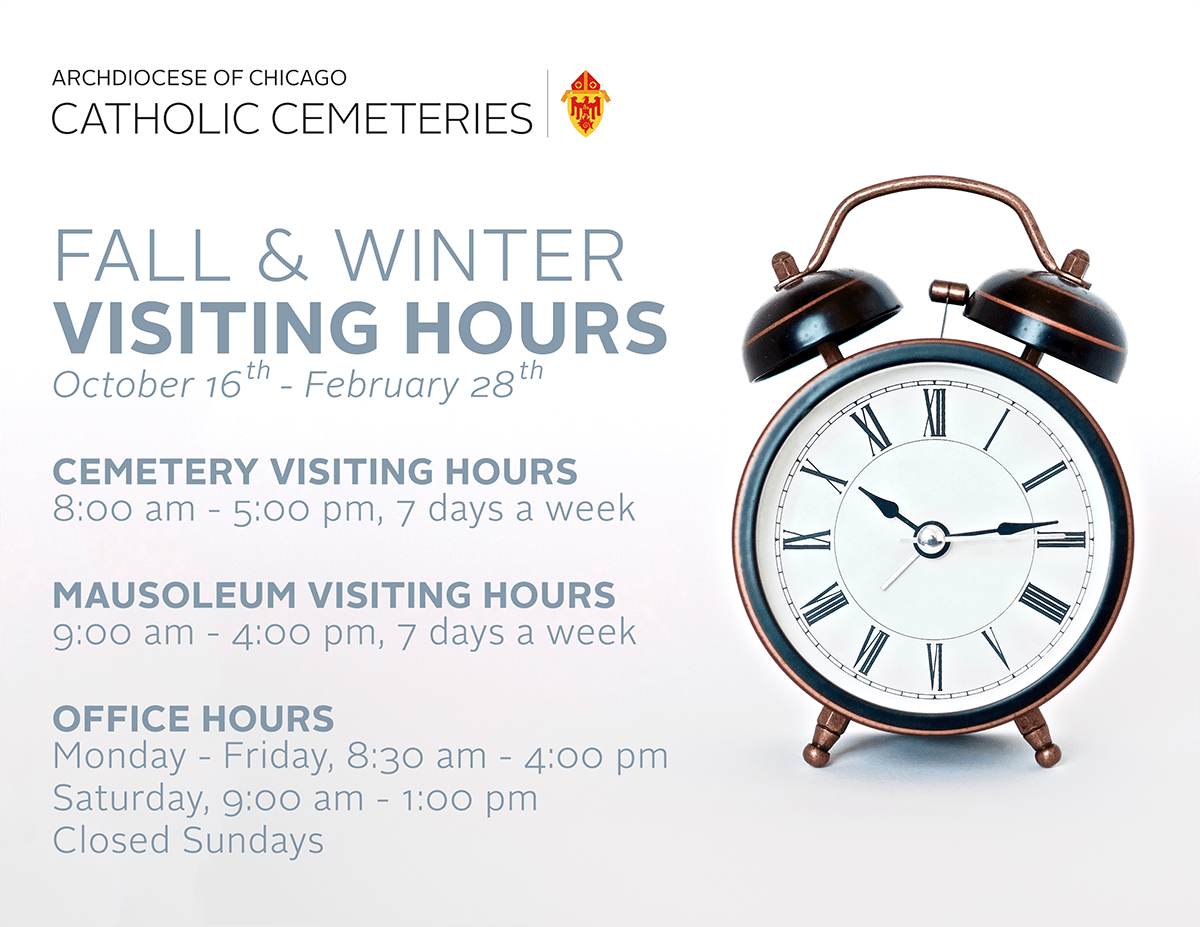 Catholic Cemeteries Fall and Winter Visiting Hours Published October 16, 2021 at 1200 × 927 in Our Parish! ← Previous Next → Like Loading...