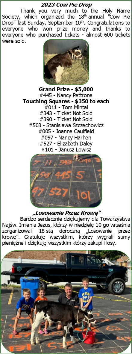 Cow Pie Drop Winners Published September 18, 2023 at 441 × 1180 in Our Parish! ← Previous Next → Like Loading...